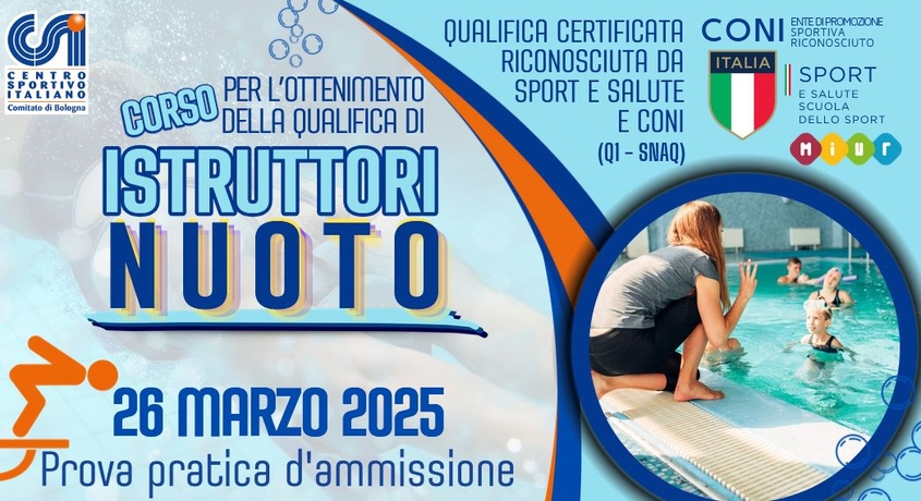 Il CSI Bologna propone un nuovo Corso per Istruttori di Nuoto con rilascio qualifica di 1° livello, riconosciuta da CONI e Sport e Salute.