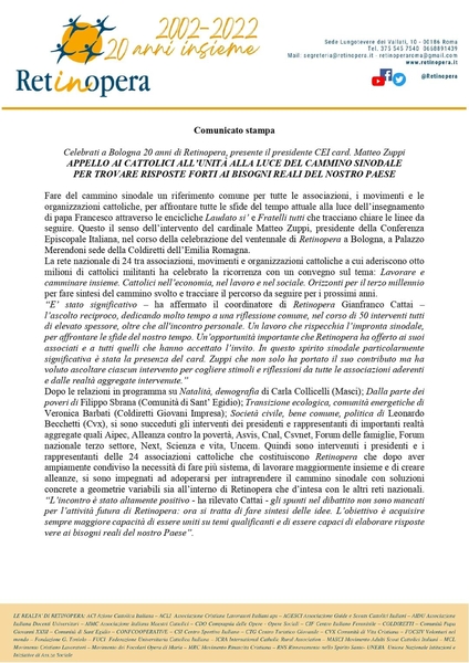 RETINOPERA - la rete di 24 tra associazioni, movimenti e organizzazioni cattoliche a livello nazionale a cui aderiscono otto milioni di cattolici militanti.