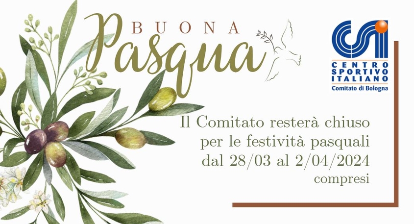 Il Comitato CSI di Bologna chiude per le festività Pasquali dal 28 marzo al 2 aprile 2024 compresi.