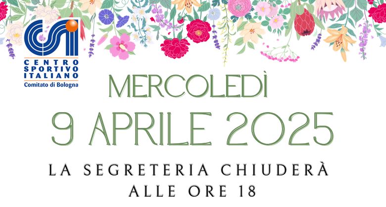 Mercoledì 9 aprile 2025, la segreteria del Comitato CSI Bologna chiuderà alle ore 18.